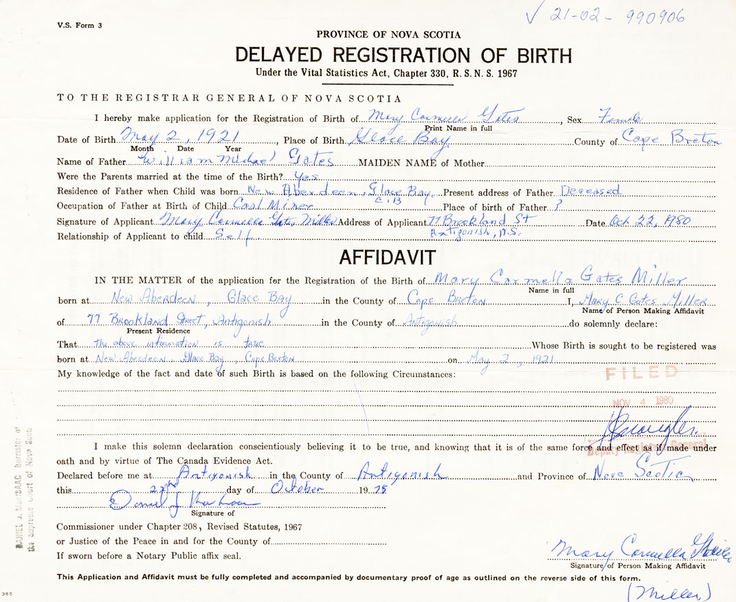 Signature of Applicant Mary Carmella Gates Miller Address of Applicant 77 Brookland St. Antigonish Date October 22, 1980