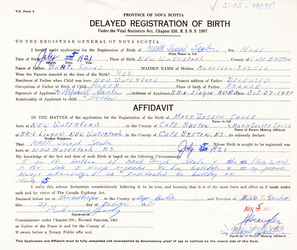 Date of Birth July 5, 1921 Place of Birth New WaterfordCounty of Cape Breton