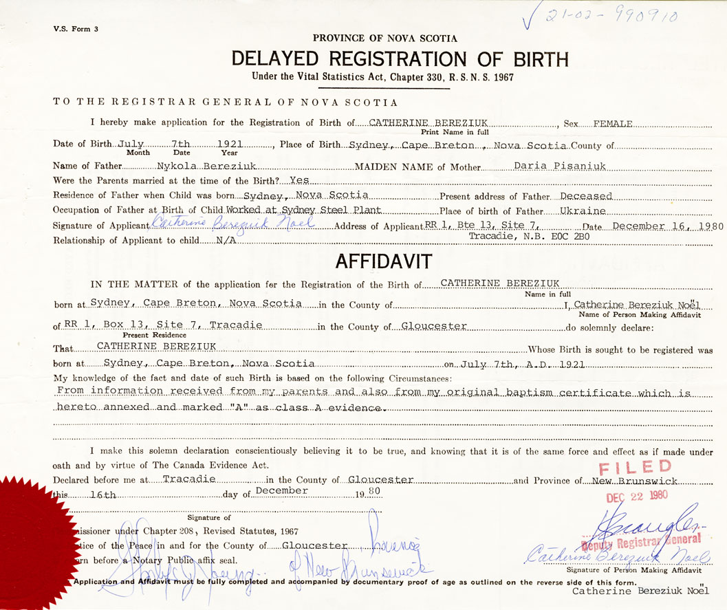 I hereby make application for the Registration of Birth of CatherineBereziuk Sex Female
