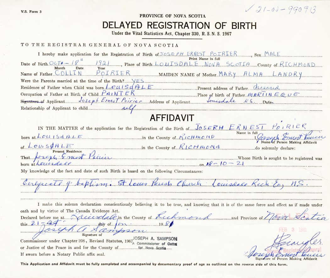 Signature of Applicant Joseph Ernest Poirier Address of Applicant Louisdale Date January 1981