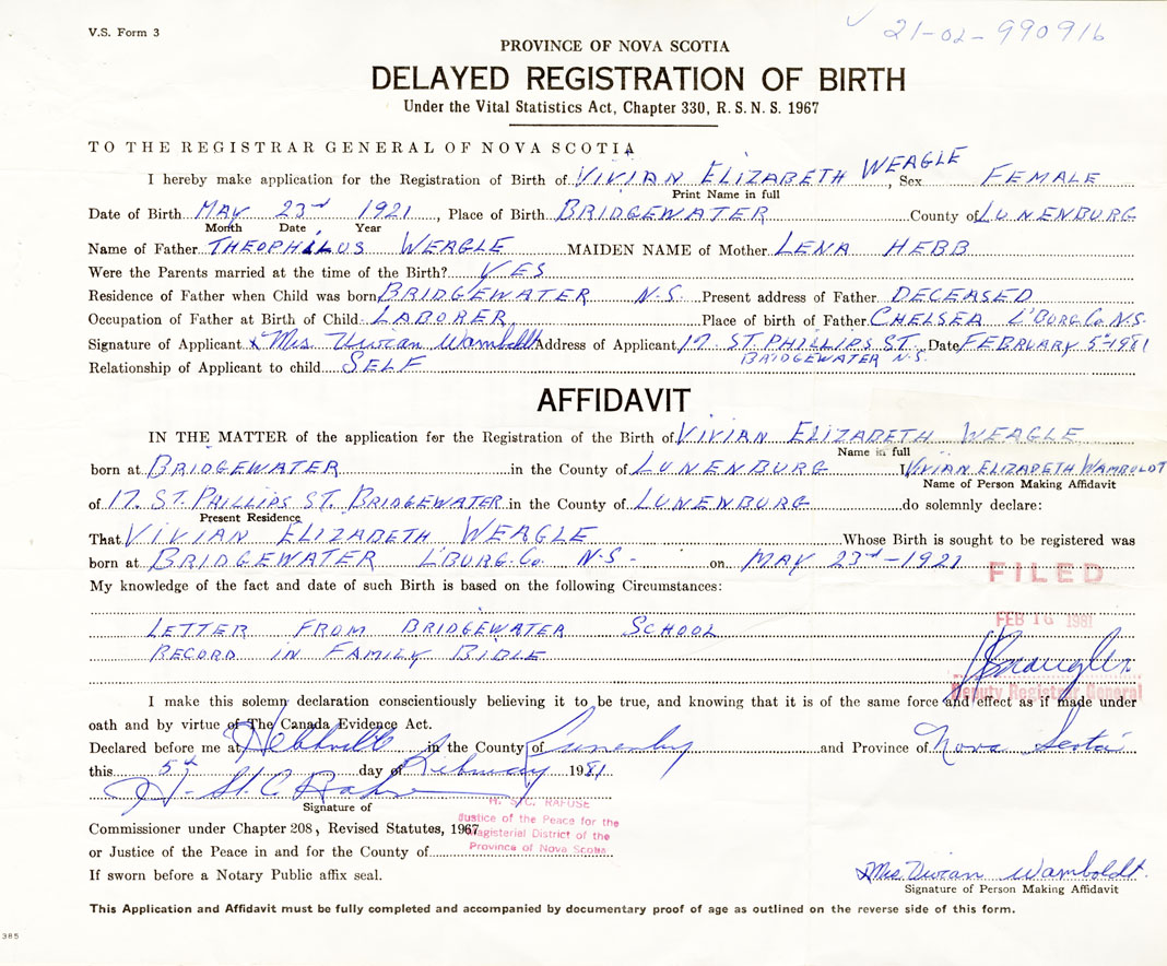 I hereby make application for the Registration of Birth of Vivian ElizabethWeagle Sex Female
