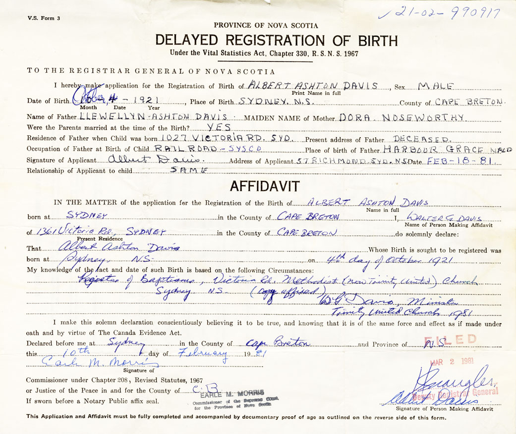 Name of Father Llewellyn Aston Davis MAIDEN NAME of Mother Dora Noseworthy