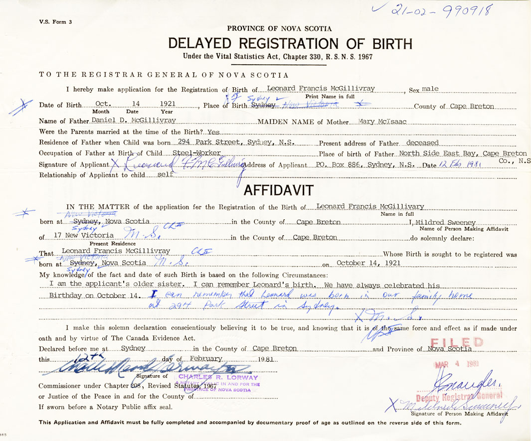 I hereby make application for the Registration of Birth of Leonard FrancisMcGillivray Sex Male