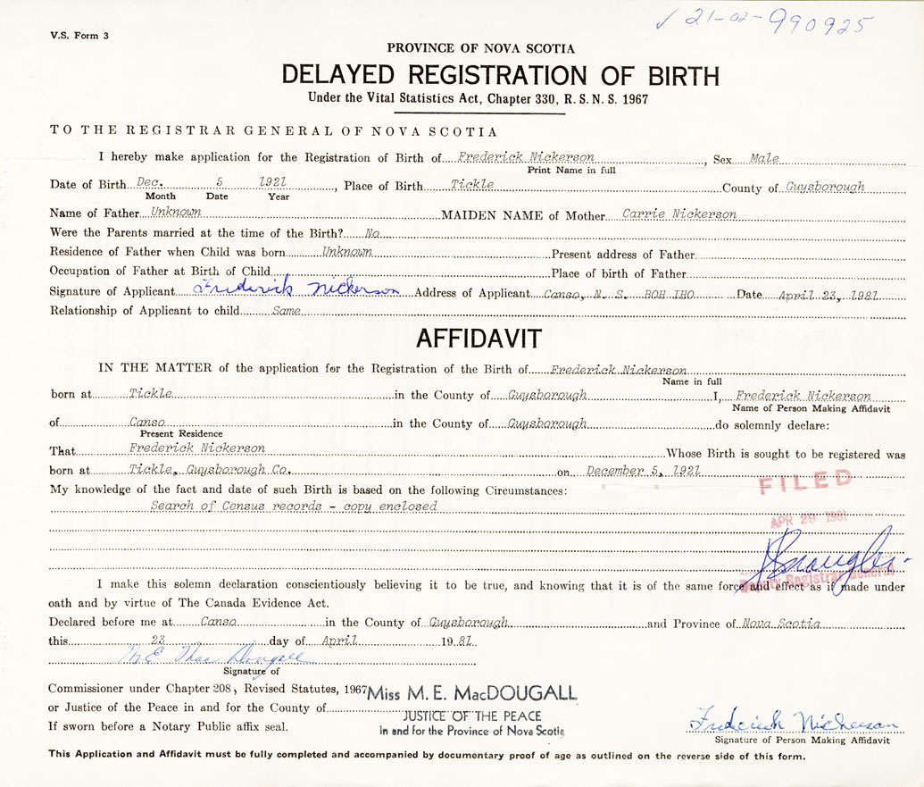 I hereby make application for the Registration of Birth of FrederickNickerson Sex Male