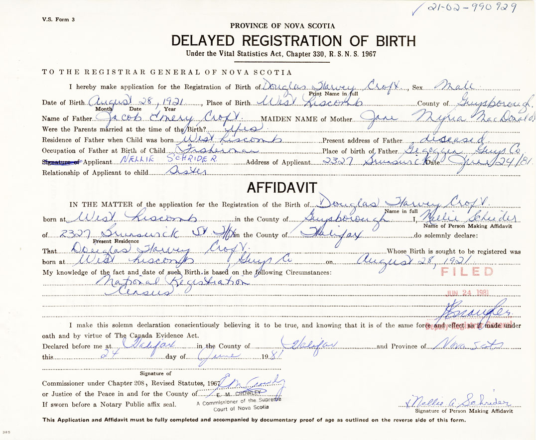 Date of Birth August 28, 1921 Place of Birth West LiscombCounty of Guysborough