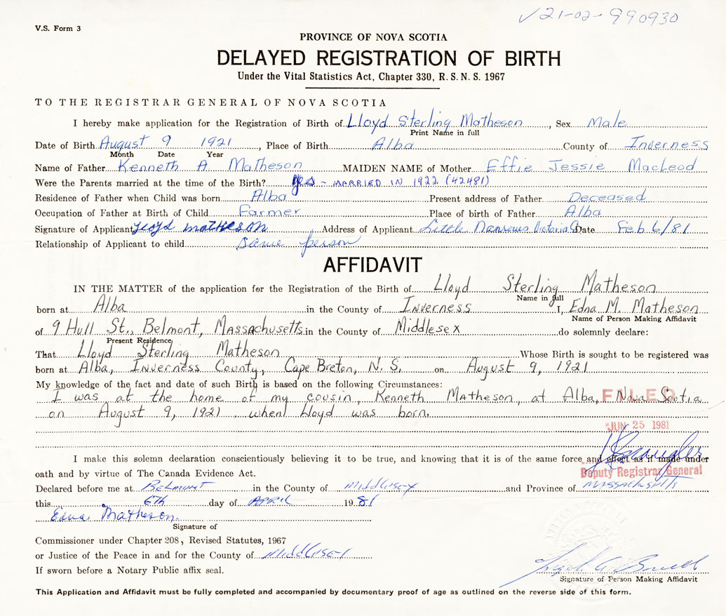 IN THE MATTER of the application for the Registration of the Birth of Lloyd SterlingMatheson