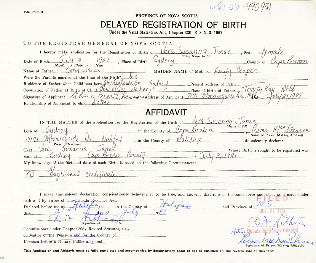 Date of Birth July 3, 1921 Place of Birth SydneyCounty of Cape Breton