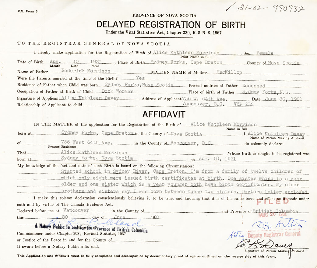 21. Name and Post Office address of Informant Alice Kathleen Davey 756 W. 64th Ave. Vancouver, British Columbia