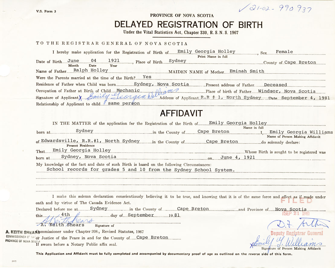 Signature of Applicant Emily Georgia Williams Address of Applicant RR1 North Sydney Date September 4, 1981