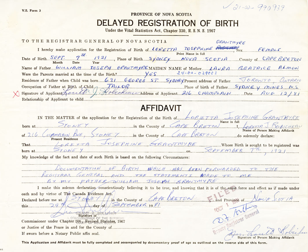 2. FULL NAME OF CHILD Grantmyre, Loretta Josephine
