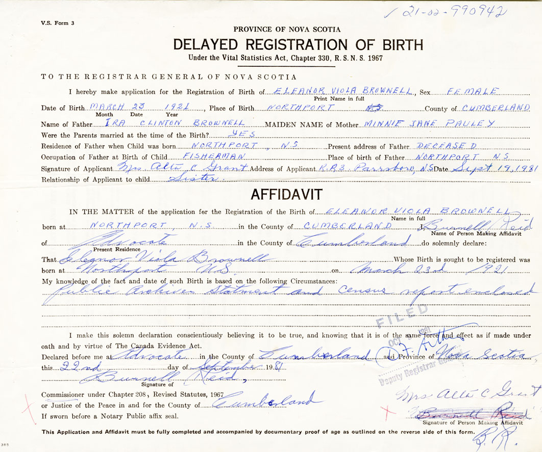 IN THE MATTER of the application for the Registration of the Birth of Eleanor ViolaBrownell
