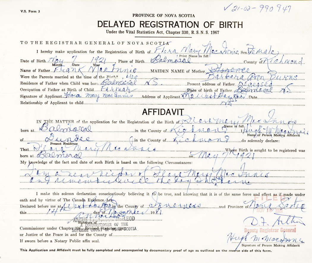 21. Name and Post Office address of Informant Flora Mary MacInnis West Bay Road