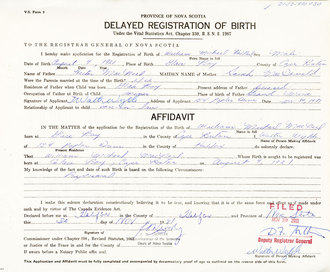 Date of Birth August 7, 1921 Place of Birth Glace BayCounty of Cape Breton