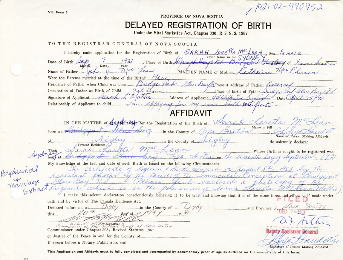 The certificate of Baptism and Birth reissued on August 8th 1953 by the assistant pastor of the Parish of the Immaculate Conception at Bridgeport Glace Bay N.S. Please find enclosed a photocopy of the original which is in the possession of Sarah Loretta MacLean Mathis
