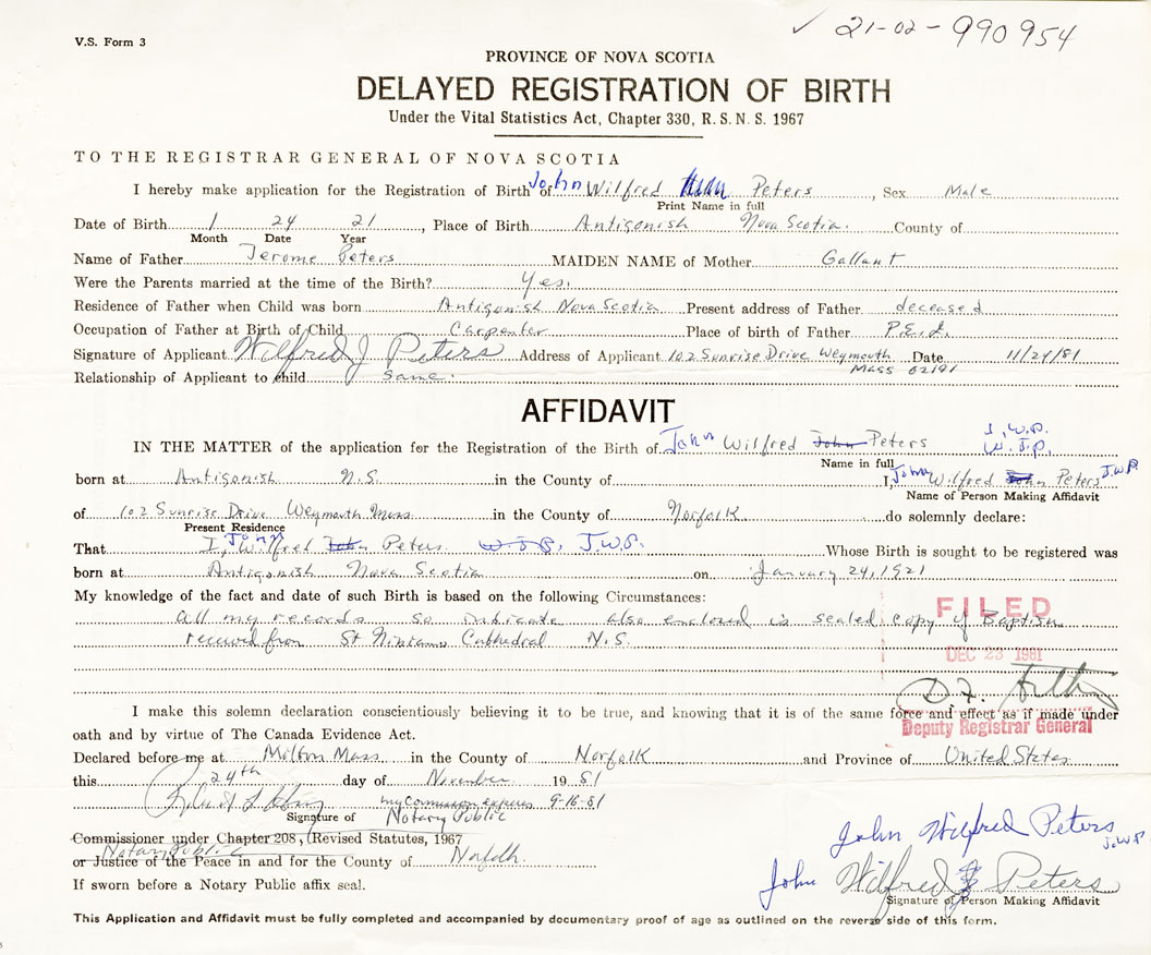 IN THE MATTER of the application for the Registration of the Birth of John WilfredPeters