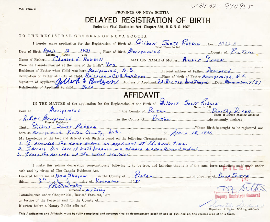 IN THE MATTER of the application for the Registration of the Birth of Gilbert ScottRobson