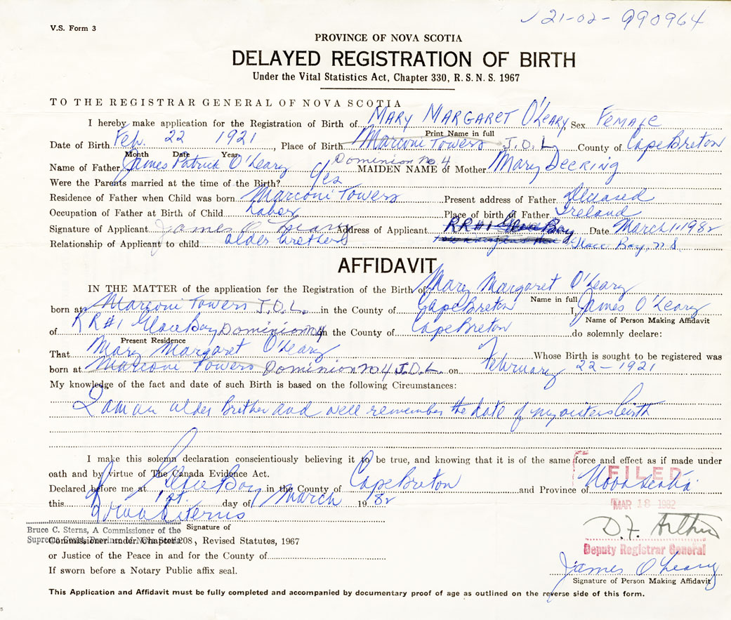 Date of Birth February 22, 1921 Place of Birth Marconi TowersCounty of Cape Breton