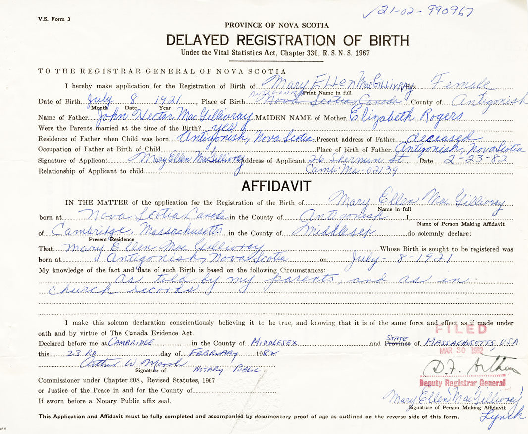21. Name and Post Office address of Informant Mary Ellen MacGillivray 26 Sherman St. Cambridge, Massachusetts, USA