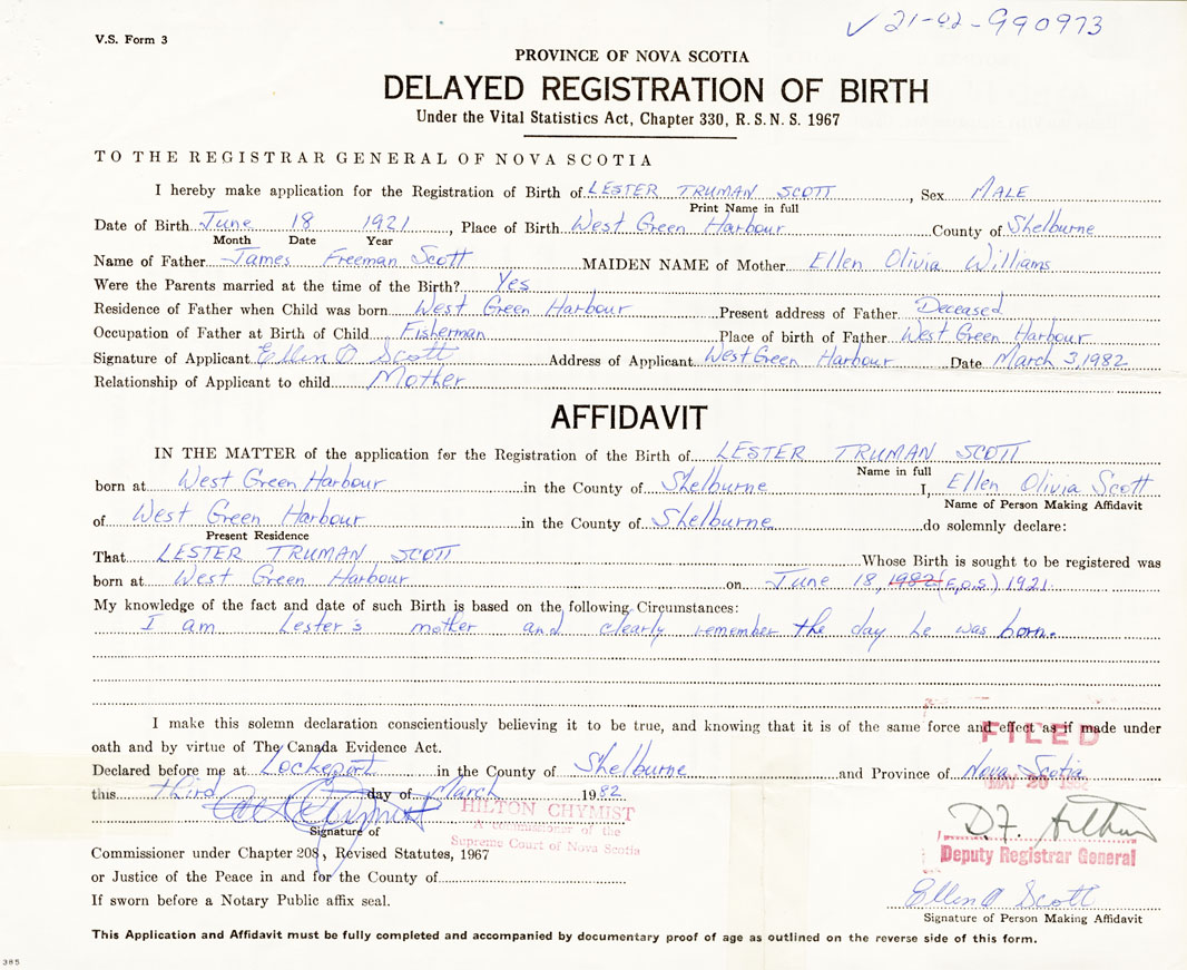 Date of Birth June 18, 1921 Place of Birth West Green HarbourCounty of Shelburne