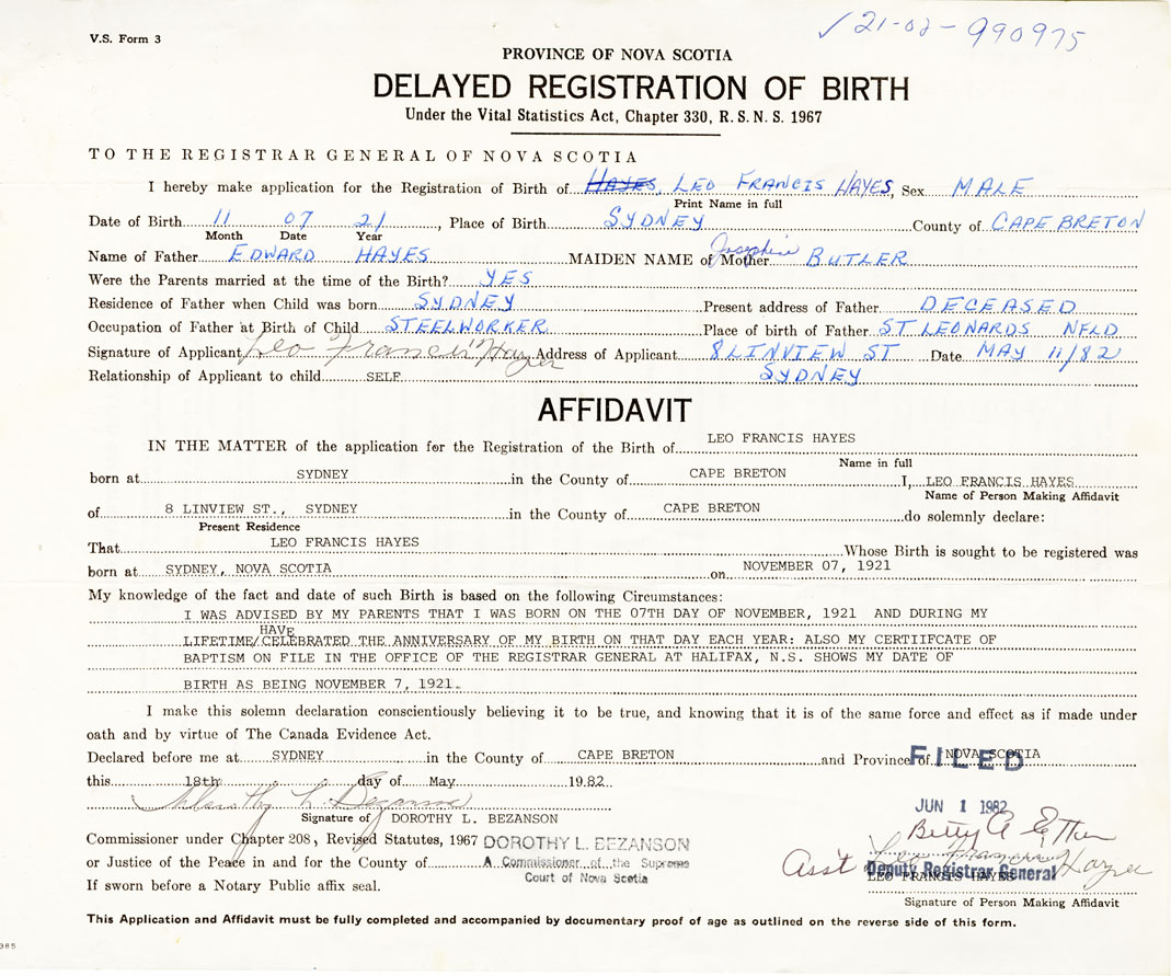 I was advised by my parents that I was born on the 7th day of November, 1921 and during my lifetime have celebrated the anniversary of my birth on that day each year. Also my Certificate of Baptism on file in the Office of the Registrar General at Halifax shows my date of birth as being November 7, 1921.