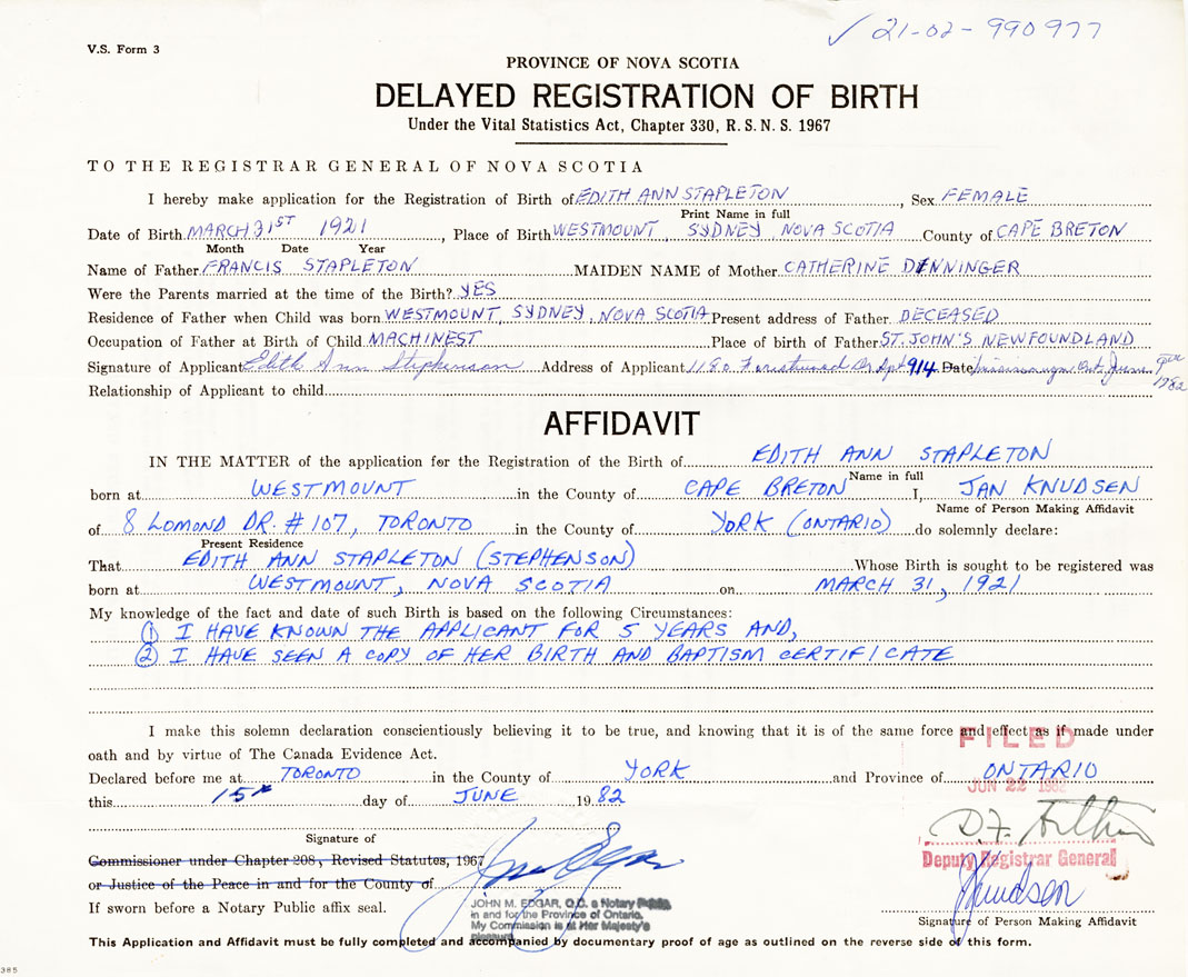 21. Name and Post Office address of Informant Edith Ann Stephenson 118 Forestuned Dr. Apt. 914 Toronto, Ontario