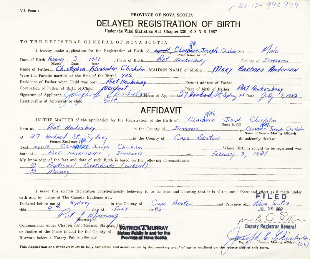 Date of Birth February 3, 1921 Place of Birth Port HawkesburyCounty of Inverness