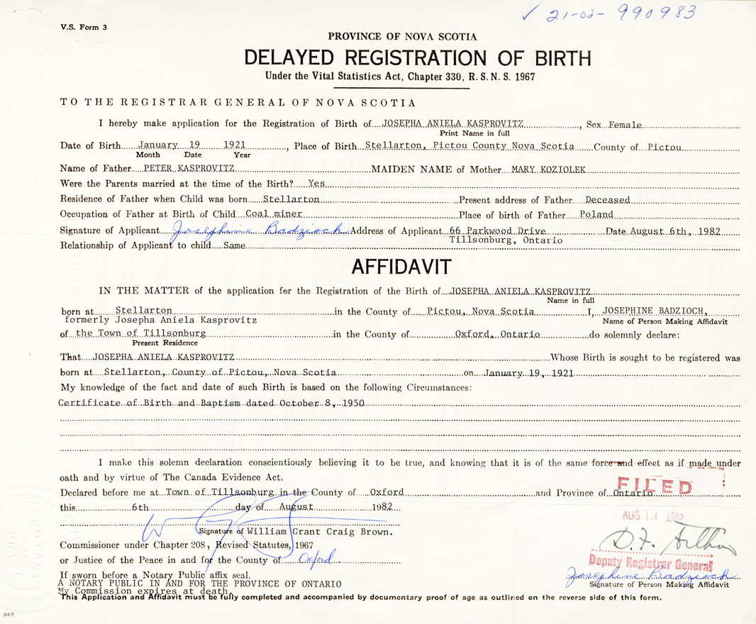 Date of Birth January 19, 1921 Place of Birth StellartonCounty of Pictou