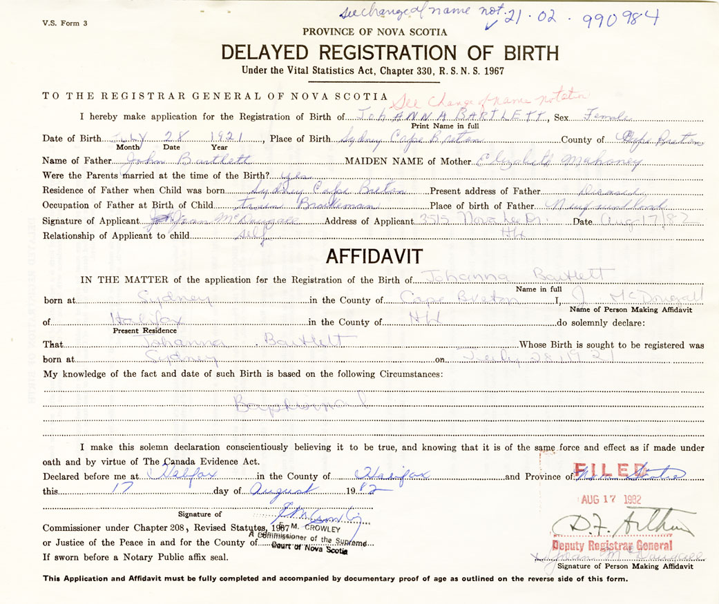 I hereby make application for the Registration of Birth of JoanBartlett Sex Female