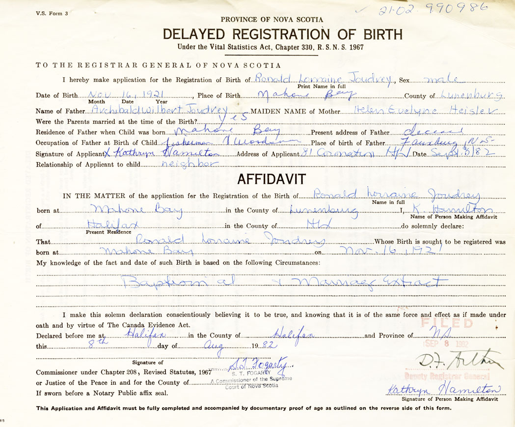 Date of Birth November 16, 1921 Place of Birth Mahone BayCounty of Lunenburg