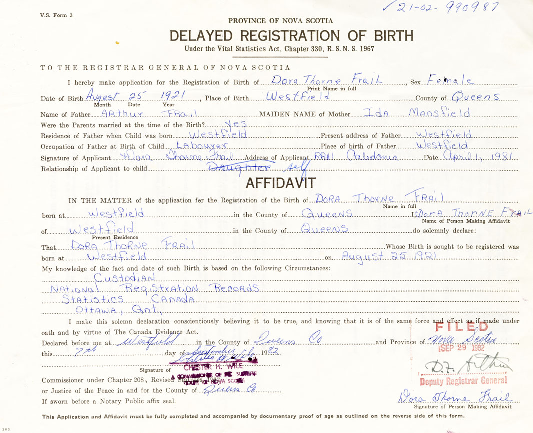 IN THE MATTER of the application for the Registration of the Birth of Dora ThorneFrail