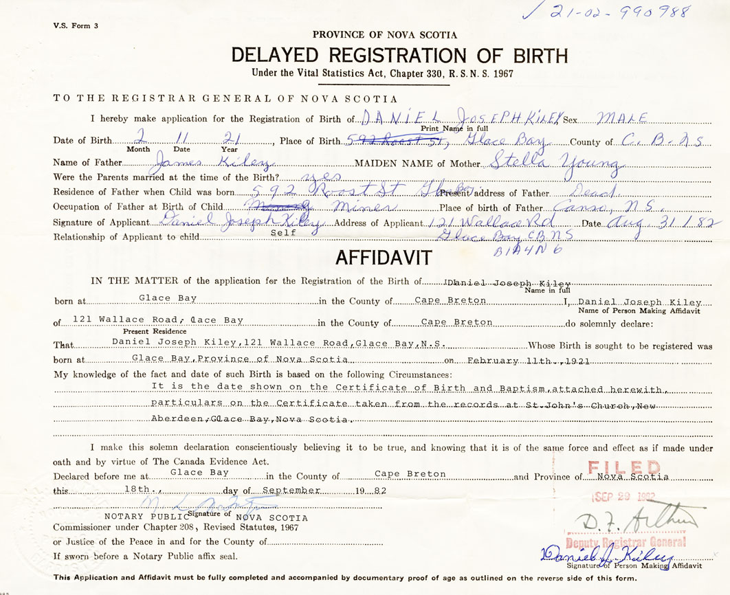 Date of Birth February 11, 1921 Place of Birth Glace BayCounty of Cape Breton