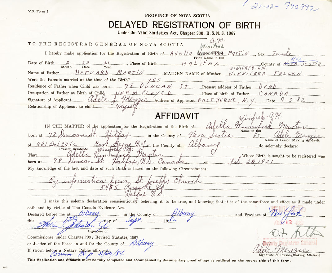 I hereby make application for the Registration of Birth of Adella WinifredMartin Sex Female