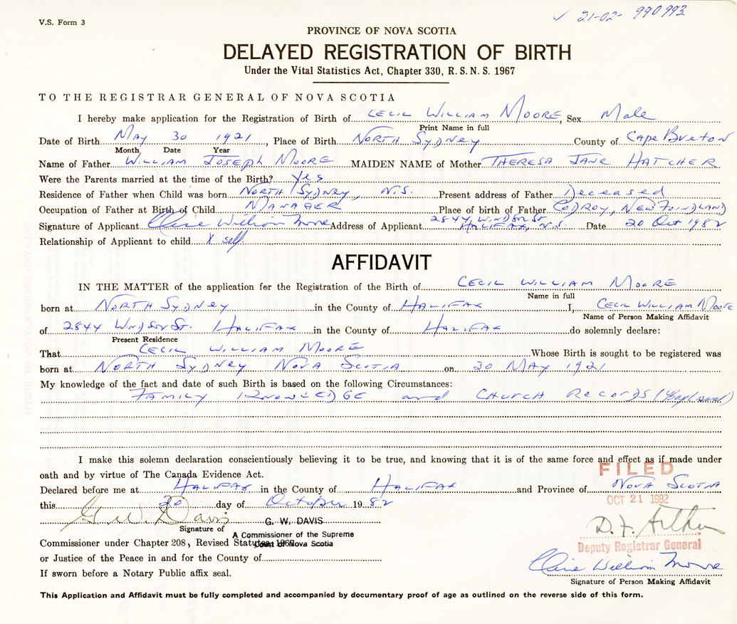 Signature of Applicant Cecil William Moore Address of Applicant 2844 Windsor St. Halifax Date 20 October 1982