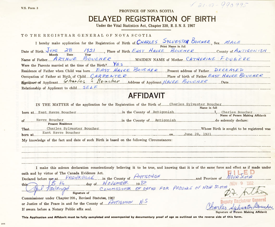 Date of Birth June 28, 1921 Place of Birth East Havre BoucherCounty of Antigonish