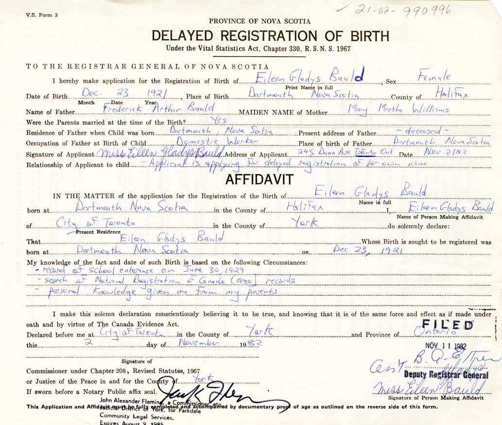 IN THE MATTER of the application for the Registration of the Birth of Eileen GladysBauld