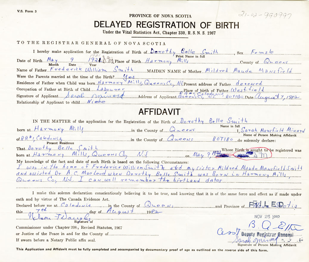 I was in the home of Frederick William Smith and my sister Mildred Maud Mansfield Smith and assisted Dr. A.C. MacLeod when Dorothy Belle Smith was born in Harmony Mills, Queens. I can well remember the birth and dates