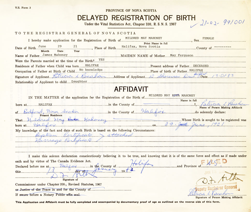 IN THE MATTER of the application for the Registration of the Birth of Mildred MayMahoney