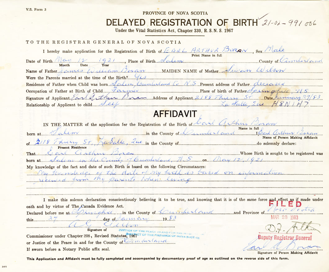 I hereby make application for the Registration of Birth of Earl ArthurBoran Sex Male
