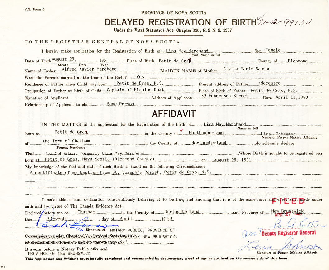 Date of Birth August 29, 1921 Place of Birth Petit-de-GratCounty of Richmond