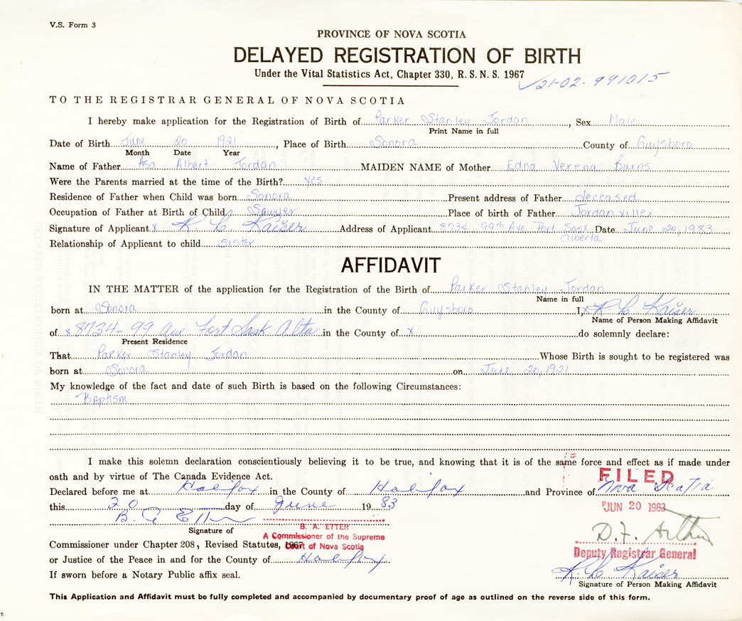Date of Birth June 20, 1921 Place of Birth SonoraCounty of Guysborough