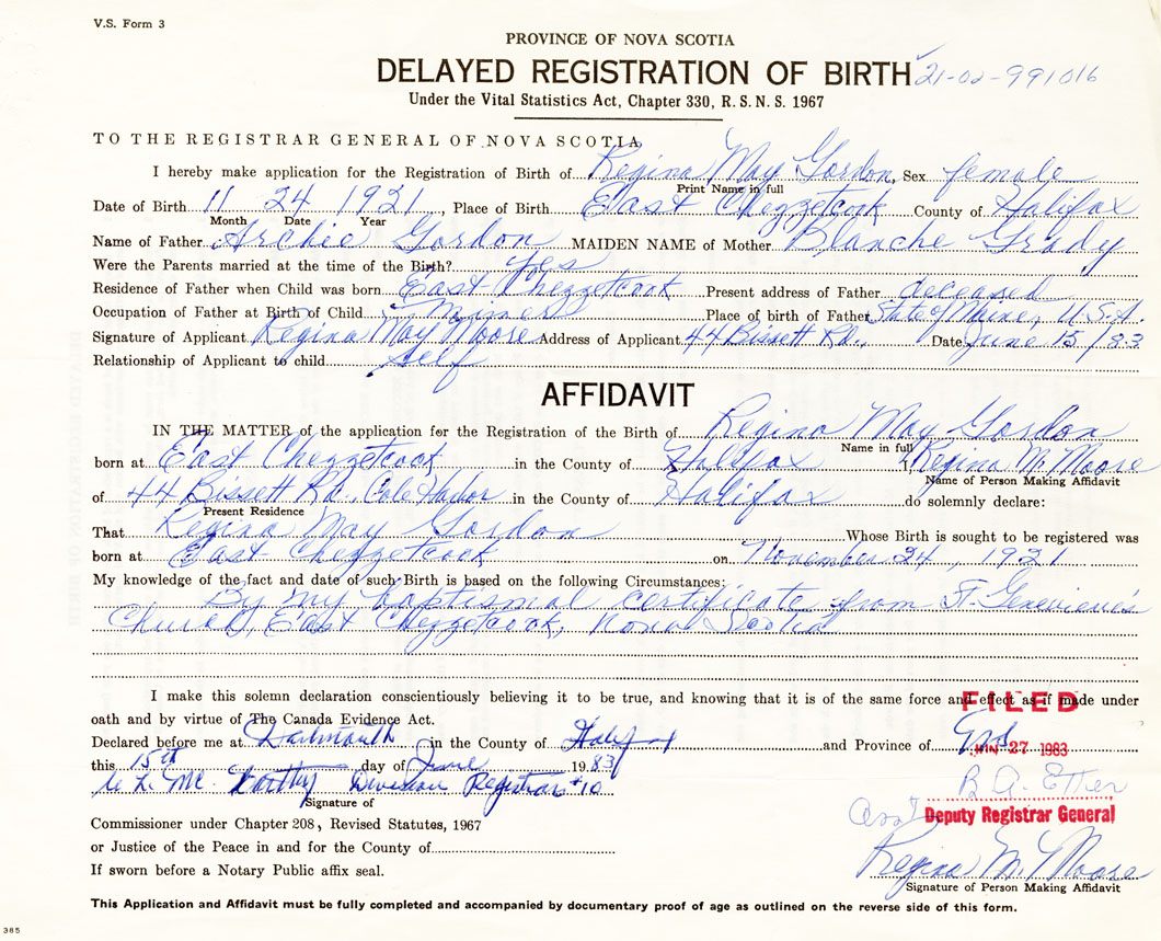 I hereby make application for the Registration of Birth of Regina MayGordon Sex Female