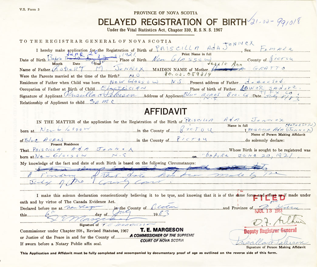 Date of Birth June 20, 1921 Place of Birth New GlasgowCounty of Pictou