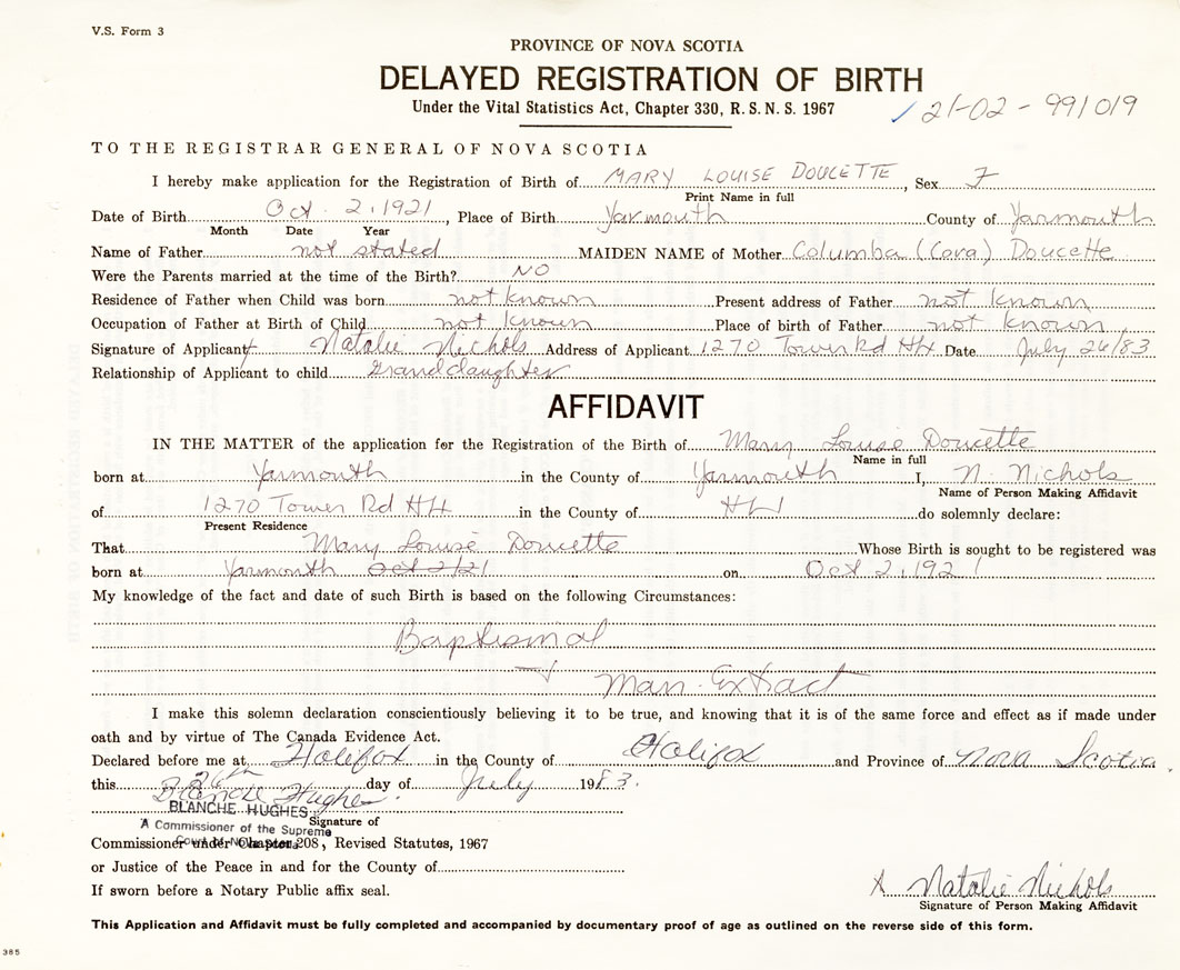 I hereby make application for the Registration of Birth of Mary LouiseDoucette Sex Female