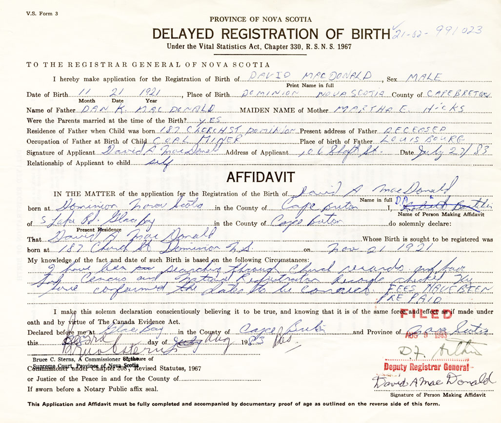Date of Birth November 21, 1921 Place of Birth DominionCounty of Cape Breton