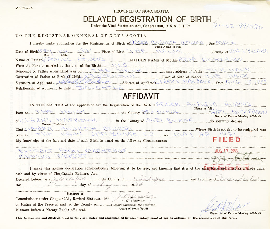 IN THE MATTER of the application for the Registration of the Birth of Abner AugustaAtwood