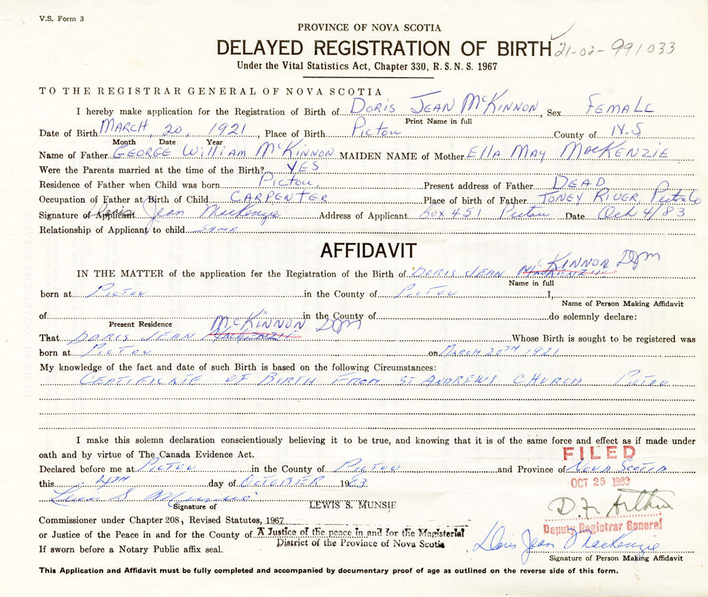 I hereby make application for the Registration of Birth of Doris JoanMcKinnon Sex Female