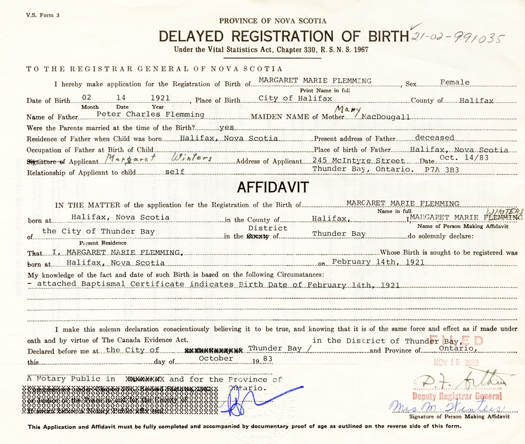 I hereby make application for the Registration of Birth of Margaret MarieFlemming Sex Female