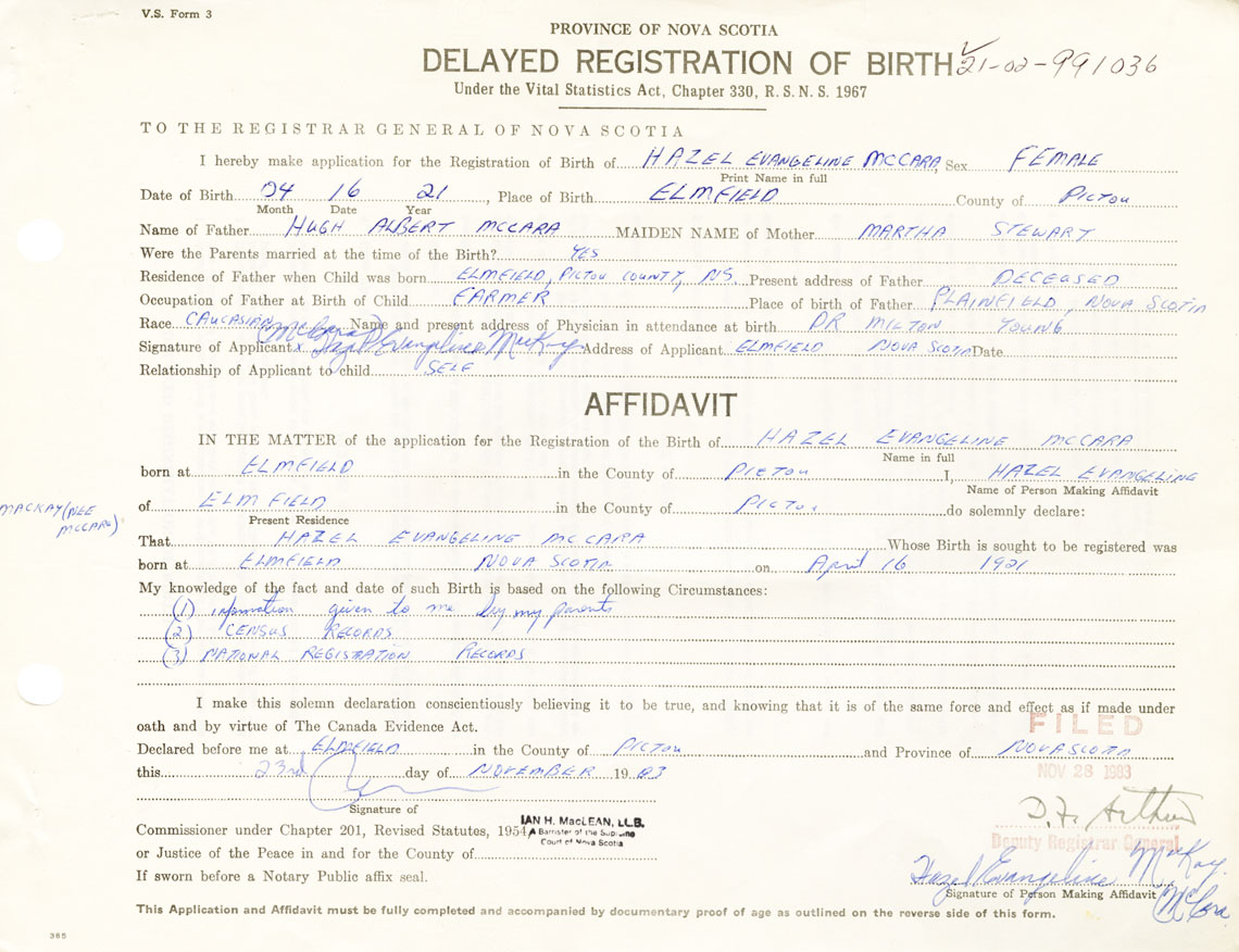 I hereby make application for the Registration of Birth of Hazel EvangelineMcCara Sex Female