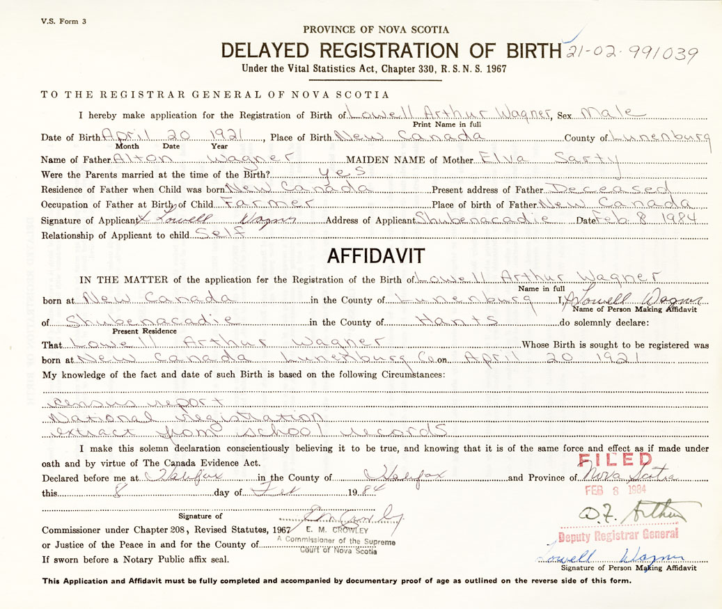 Date of Birth April 20, 1921 Place of Birth New CanadaCounty of Lunenburg
