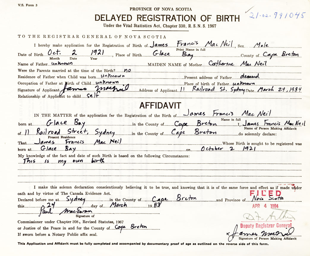 IN THE MATTER of the application for the Registration of the Birth of James FrancisMacNeil
